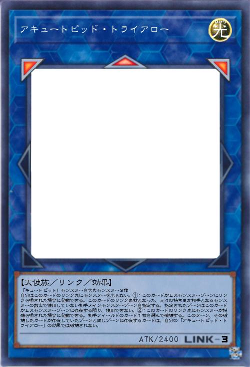 | 「キュートピット」モンスターを含むモンスター3体 自分はこのカードのリンク先にモンスターを出せない。①:このカードがEXモンスターゾーンにリンク召喚された場合に発動できる。このカードのリンク素材となった、元々の持ち主が相手となるモンスターの数まで使用していない相手メインモンスターゾーンを指定する。指定されたゾーンはこのカードがEXモンスターゾーンに存在する限り、使用できない。②:このカードのリンク先にモンスターが特殊召喚された場合に発動できる。相手フィールドのカード1枚を選んで破壊する。このターン、その破壊したカードが存在していたゾーンと同じゾーンに存在するカードは、自分の「アキュートピッド・トライアロー」の効果では破壊されない。 | |||