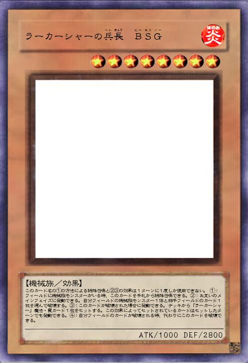 | このカード名の①の方法による特殊召喚と②③の効果は1ターンに1度しか使用できない。 ①:フィールドに機械族モンスターがいる時、このカードを手札から特殊召喚できる。②:お互いのメインフェイズに発動できる。自分フィールドの機械族モンスター1体と相手フィールドのカード1枚を選んで破壊する。③:このカードが破壊された場合に発動できる。デッキから「ラーカーシャー」魔法・罠カード1枚をセットする。この効果によってセットされているカードはセットしたターンでも発動できる。④:自分フィールドのカードが破壊される時、代わりにこのカードを破壊できる。 | |||