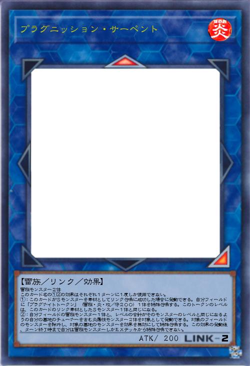 | 雷族モンスター2体 このカード名の①②の効果はそれぞれ1ターンに1度しか使用できない。 ①:このカードがSモンスターを素材としてリンク召喚に成功した場合に発動できる。自分フィールドに「プラグナイトトークン」(雷族・炎・攻/守200)1体を特殊召喚する。このトークンのレベルは、このカードのリンク素材としたSモンスター1体と同じになる。 ②:自分フィールドの雷族モンスター1体と、レベルの合計がそのモンスターのレベルと同じになるようの自分の墓地のチューナーを含む炎属性モンスター2体を対象として発動できる。対象のフィールドのモンスターを除外し、対象の墓地のモンスターを効果を無効にして特殊召喚する。この効果の発動後、ターン終了時まで自分は雷族モンスターしかEXデッキから特殊召喚できない。 | |||