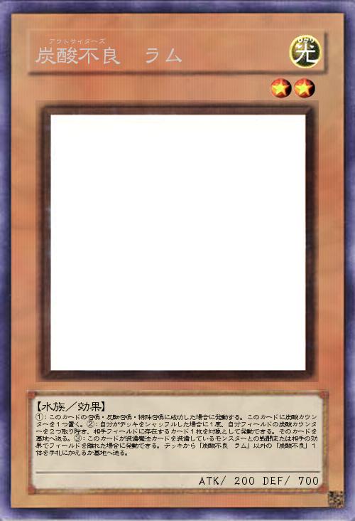 | ①:このカードの召喚・反転召喚・特殊召喚に成功した場合に発動する。このカードに炭酸カウンターを1つ置く。②:自分がデッキをシャッフルした場合に1度、自分フィールドの炭酸カウンターを2つ取り除き、相手フィールドに存在するカード1枚を対象として発動できる。そのカードを墓地へ送る。③:このカードが装備魔法カードを装備しているモンスターとの戦闘または相手の効果でフィールドを離れた場合に発動できる。デッキから「炭酸不良 ラム」以外の「炭酸不良」1体を手札に加えるか墓地へ送る。 | |||
