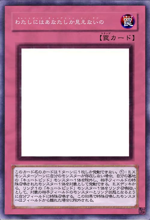 | このカード名のカードは1ターンに1枚しか発動できない。①:EXモンスターゾーンに自分のモンスターが存在しない場合、自分の墓地の「キュートピッド」モンスター1体を除外し、相手フィールドの特殊召喚されたモンスター1体を対象として発動できる。EXデッキから、リンク1の「キュートピッド」モンスター1体をリンク召喚扱いとして、対象の相手フィールドのモンスターとリンク状態となるように自分フィールドに特殊召喚する。この効果で特殊召喚したモンスターはフィールドから離れた場合に除外される。 | |||
