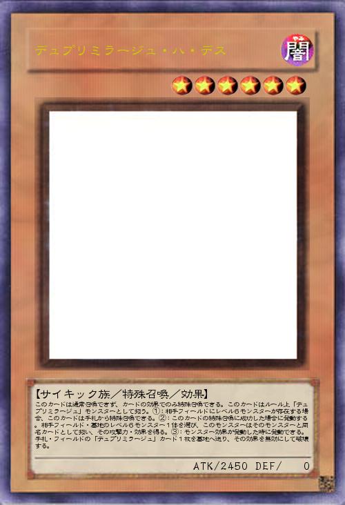 | このカードは通常召喚できず、カードの効果でのみ特殊召喚できる。このカードはルール上「デュプリミラージュ」モンスターとして扱う。①:相手フィールドにレベル6モンスターが存在する場合、このカードは手札から特殊召喚できる。②:このカードの特殊召喚に成功した場合に発動する。相手フィールド・墓地のレベル6モンスター1体を選び、このモンスターはそのモンスターと同名カードとして扱い、その攻撃力・効果を得る。③:モンスター効果が発動した時に発動できる。手札・フィールドの「デュプリミラージュ」カード1枚を墓地へ送り、その効果を無効にして破壊する。 | |||