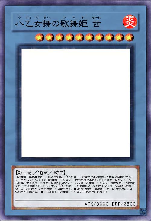 | 「歌舞姫」儀式魔法カードにより降臨。①:このカードの儀式召喚に成功した場合に発動できる。デッキからレベル7以下の「歌舞姫」モンスター1体を特殊召喚する。①:このカードがフィールドに存在する限り、このカード以外の自分フィールドの「歌舞姫」モンスターの攻撃力・守備力はそれぞれ1000ポイントアップする。②:このカードの戦闘によって相手モンスターを破壊した場合、以下の効果から1つを選択して発動できる。●自分の墓地の「歌舞姫」カード1枚を選び、自分の手札に加える。 ●デッキから「歌舞姫」モンスター1体を手札に加える。 | |||