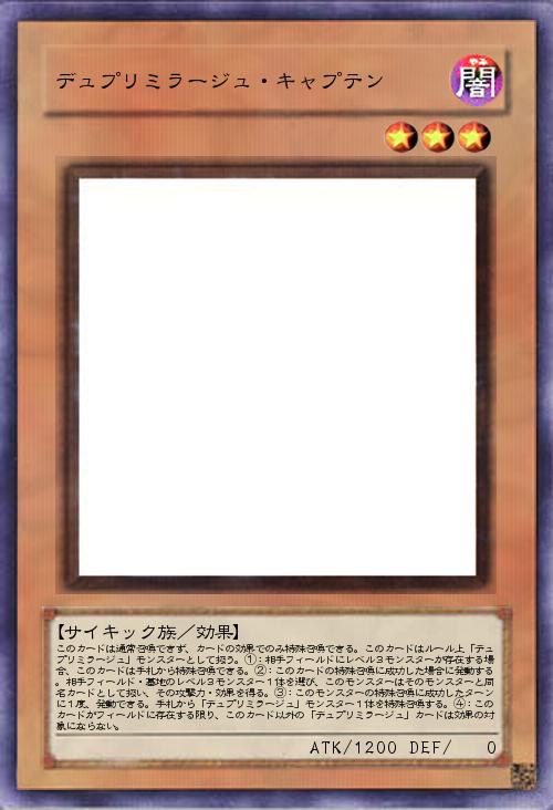 | このカードは通常召喚できず、カードの効果でのみ特殊召喚できる。このカードはルール上「デュプリミラージュ」モンスターとして扱う。①:相手フィールドにレベル3モンスターが存在する場合、このカードは手札から特殊召喚できる。②:このカードの特殊召喚に成功した場合に発動する。相手フィールド・墓地のレベル3モンスター1体を選び、このモンスターはそのモンスターと同名カードとして扱い、その攻撃力・効果を得る。③:このモンスターの特殊召喚に成功したターンに1度、発動できる。手札から「デュプリミラージュ」モンスター1体を特殊召喚する。④:このカードがフィールドに存在する限り、このカード以外の「デュプリミラージュ」カードは効果の対象にならない。 | |||