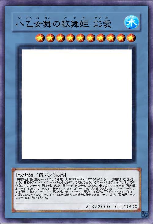 | 「歌舞姫」儀式魔法カードにより降臨。①:1000LP払い、以下の効果から1つを選択して発動できる。●相手フィールドのカード1枚を対象にして発動できる。そのカードをデッキに戻す。その後自分のデッキから「歌舞姫」魔法・罠カード1枚を手札に加える。●自分のデッキから「歌舞姫」カード1枚を手札に加える。●デッキから1枚ドローする。②:儀式召喚したこのカードが存在する限り、自分フィールドの「歌舞姫」モンスターの攻撃力・守備力は500ポイントアップする。③:このカードがフィールドから墓地に送られた場合に発動できる。デッキから「歌舞姫」モンスター1体を特殊召喚する。 | |||
