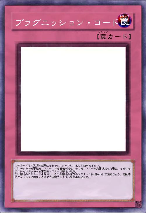 | このカード名の①②の効果はそれぞれ1ターンに1度しか使用できない。 ①:デッキから雷族モンスター1体を墓地へ送る。そのモンスターが炎属性だった場合、さらにもう1体だけデッキから雷族モンスターを墓地へ送る。 ②:墓地のこのカードを除外し、自分の墓地の雷族モンスター1体を除外して発動できる。発動時にフィールドに存在する全ての雷族モンスターは炎属性になる。 | |||