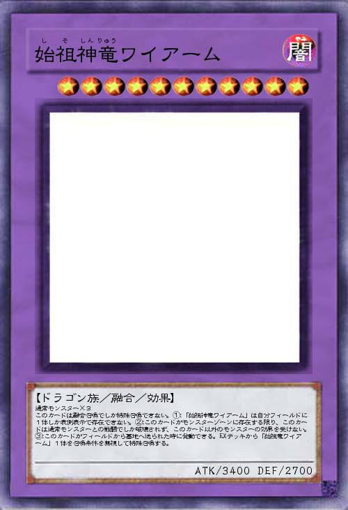 | 通常モンスター×3 このカードは融合召喚でしか特殊召喚できない。①:「始祖神竜ワイアーム」は自分フィールドに1体しか表側表示で存在できない。②:このカードがモンスターゾーンに存在する限り、このカードは通常モンスターとの戦闘でしか破壊されず、このカード以外のモンスターの効果を受けない。③:このカードがフィールドから墓地へ送られた時に発動できる。EXデッキから「始祖竜ワイアーム」1体を召喚条件を無視して特殊召喚する。 | |||