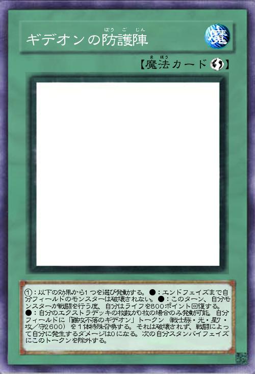 | ①:以下の効果から1つを選び発動する。●:エンドフェイズまで自分フィールドのモンスターは破壊されない。●:このターン、自分モンスターが戦闘を行う度、自分はライフを800ポイント回復する。●:自分のエクストラデッキの枚数が0枚の場合のみ発動可能。自分フィールドに「難攻不落のギデオン」トークン(戦士族・光・星7・攻/守2600)を1体特殊召喚する。それは破壊されず、戦闘によって自分に発生するダメージは0になる。次の自分スタンバイフェイズにこのトークンを除外する。 | |||