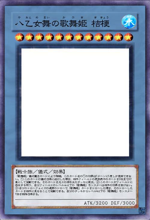 | 「歌舞姫」儀式魔法カードにより降臨。このカード名の①の効果は1ターンに1度しか使用できない。①:このカードの儀式召喚に成功した場合、相手フィールドの表側表示のカードを3枚まで対象にして発動できる。そのカードを元々の持ち主のデッキに戻す。②:このカードがフィールドに存在する限り、自分フィールドのレベル4以下の「歌舞姫」モンスターは相手の効果を受けない。③:自分のドローフェイズの通常のドローで「歌舞姫」カードをドローした場合、そのドローしたカードを相手に見せることで発動できる。自分のデッキからレベル4以下の「歌舞姫」モンスター1体を特殊召喚する。 | |||