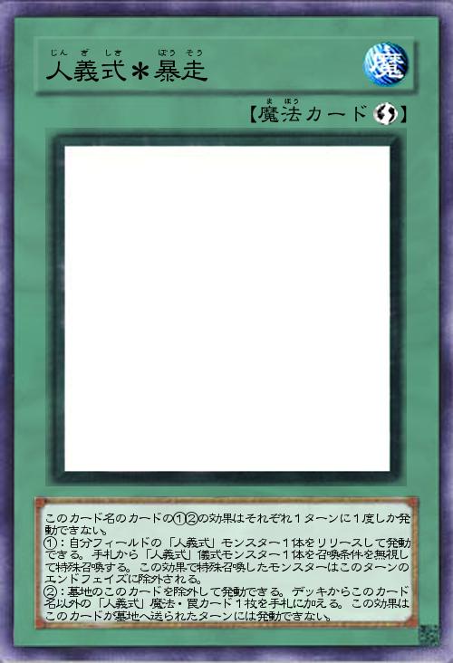 | このカード名のカードの①②の効果はそれぞれ1ターンに1度しか発動できない。 ①:自分フィールドの「人義式」モンスター1体をリリースして発動できる。手札から「人義式」儀式モンスター1体を召喚条件を無視して特殊召喚する。この効果で特殊召喚したモンスターはこのターンのエンドフェイズに除外される。 ②:墓地のこのカードを除外して発動できる。デッキからこのカード名以外の「人義式」魔法・罠カード1枚を手札に加える。この効果はこのカードが墓地へ送られたターンには発動できない。 | |||