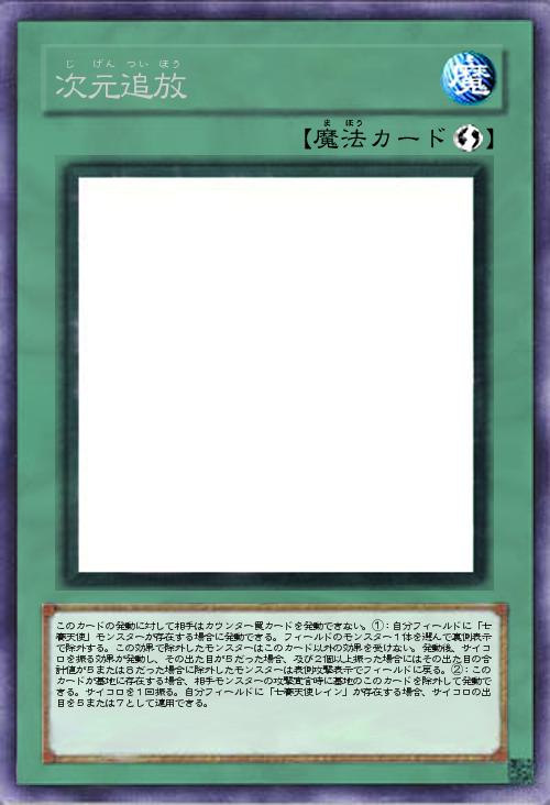 | このカードの発動に対して相手はカウンター罠カードを発動できない。①:自分フィールドに「七賽天使」モンスターが存在する場合に発動できる。フィールドのモンスター1体を選んで裏側表示で除外する。この効果で除外したモンスターはこのカード以外の効果を受けない。発動後、サイコロを振る効果が発動し、その出た目が5だった場合、及び2個以上振った場合にはその出た目の合計値が5または8だった場合に除外したモンスターは表側攻撃表示でフィールドに戻る。②:このカードが墓地に存在する場合、相手モンスターの攻撃宣言時に墓地のこのカードを除外して発動できる。サイコロを1回振る。自分フィールドに「七賽天使レイン」が存在する場合、サイコロの出目を5または7として適用できる。 | |||