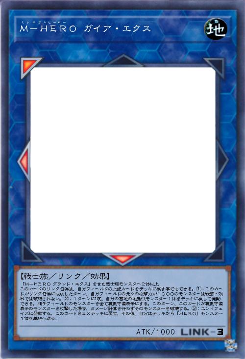 | 「M-HERO グランド・エクス」を含む戦士族モンスター2体以上 このカードのリンク召喚は、自分フィールドの上記カードをデッキに戻す事でもできる。①:このカードがリンク召喚に成功したターン、自分フィールドの元々の攻撃力が1000のモンスターは戦闘・効果では破壊されない。②:1ターンに1度、自分の墓地の地属性モンスター1体をデッキに戻して発動できる。相手フィールドのモンスターを全て裏側守備表示にする。このターン、このカードが裏側守備表示のモンスターを攻撃した場合、ダメージ計算を行わずそのモンスターを破壊する。③:エンドフェイズに発動する。このカードをEXデッキに戻す。その後、自分はデッキから「HERO」モンスター1体を墓地へ送る。 | |||