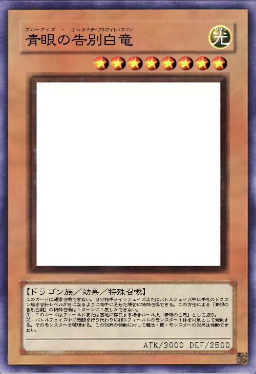 | このカードは通常召喚できない。自分相手メインフェイズまたはバトルフェイズ中に手札のドラゴン族を合計レベルが8になるように相手に見せた場合に特殊召喚できる。この方法による「青眼の告別白龍」の特殊召喚は1ターンに1度しかできない。 ①:このカードはフィールドまたは墓地に存在する場合ルール上「青眼の白竜」として扱う。 ②:バトルフェイズ中に戦闘を行う代わりに相手フィールドのモンスター1体を対象として発動する。そのモンスターを破壊する。この効果の発動に対して魔法・罠・モンスターの効果は発動できない。 | |||