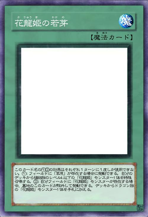 | このカード名の①②の効果はそれぞれ1ターンに1度しか使用できない。①:フィールドに「草原」が存在する場合に発動できる。自分のデッキから植物族のレベル4以下の「花龍姫」モンスター1体を特殊召喚する。②:自分フィールドに「花龍姫」モンスターが存在する場合、墓地のこのカードが除外して発動できる。デッキからドラゴン族の「花龍姫」モンスター1体を手札に加える。 | |||