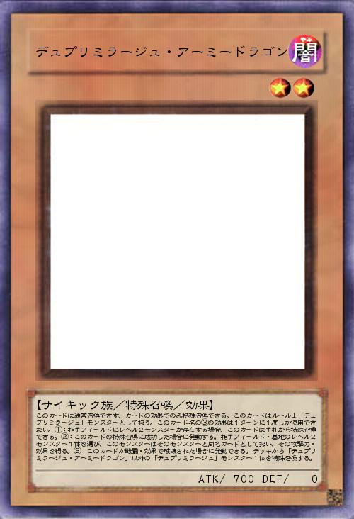| このカードは通常召喚できず、カードの効果でのみ特殊召喚できる。このカードはルール上「デュプリミラージュ」モンスターとして扱う。このカード名の③の効果は1ターンに1度しか使用できない。①:相手フィールドにレベル2モンスターが存在する場合、このカードは手札から特殊召喚できる。②:このカードの特殊召喚に成功した場合に発動する。相手フィールド・墓地のレベル2モンスター1体を選び、このモンスターはそのモンスターと同名カードとして扱い、その攻撃力・効果を得る。③:このカードが戦闘・効果で破壊された場合に発動できる。デッキから「デュプリミラージュ・アーミードラゴン」以外の「デュプリミラージュ」モンスター1体を特殊召喚する。 | |||