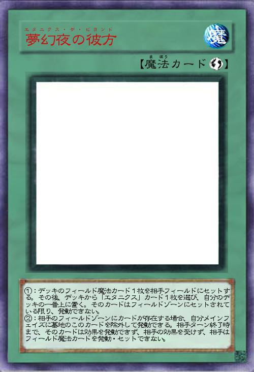 | ①:デッキのフィールド魔法カード1枚を相手フィールドにセットする。その後、デッキから「エタニクス」カード1枚を選び、自分のデッキの一番上に置く。そのカードはフィールドゾーンにセットされている限り、発動できない。 ②:相手のフィールドゾーンにカードが存在する場合、自分メインフェイズに墓地のこのカードを除外して発動できる。相手ターン終了時まで、そのカードは効果を発動できず、相手の効果を受けず、相手はフィールド魔法カードを発動・セットできない。 | |||