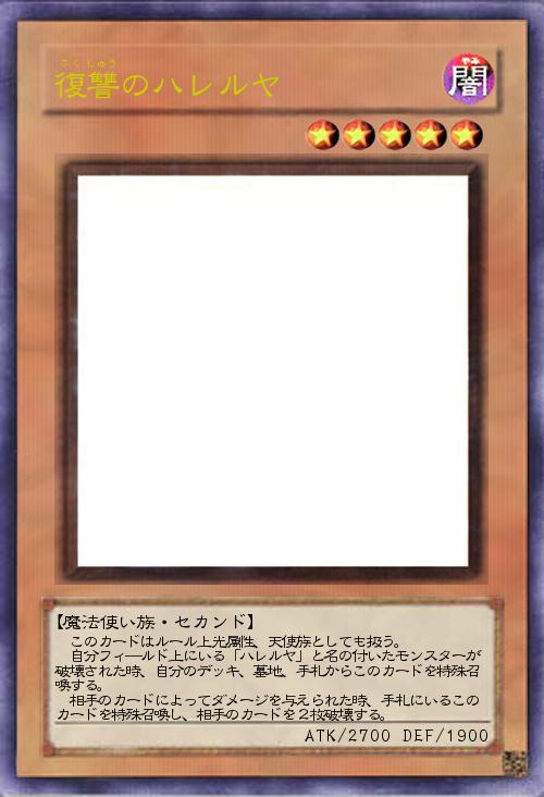 このカードはルール上光属性、天使族としても扱う。 自分フィ―ルド上にいる「ハレルヤ」と名の付いたモンスターが破壊された時、自分のデッキ、墓地、手札からこのカードを特殊召喚する。 相手のカードによってダメージを与えられた時、手札にいるこのカードを特殊召喚し、相手のカードを2枚破壊する。 |