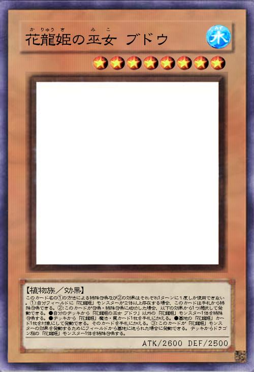 | このカード名の①の方法による特殊召喚及び②の効果はそれぞれ1ターンに1度しか使用できない。①:自分フィールドに「花龍姫」モンスターが2体以上存在する場合、このカードは手札から特殊召喚できる。②:このカードが召喚・特殊召喚に成功した場合、以下の効果から1つ選択して発動できる。●自分のデッキから「花龍姫の巫女 ブドウ」以外の「花龍姫」モンスター1体を特殊召喚する。●デッキから「花龍姫」魔法・罠カード1枚を手札に加える。●墓地の「花龍姫」カード1枚を対象にして発動できる。そのカードを手札に加える。③:このカードが「花龍姫」モンスターの効果を発動するためにフィールドから墓地に送られた場合に発動できる。デッキからドラゴン族の「花龍姫」モンスター1体を特殊召喚する。 | |||