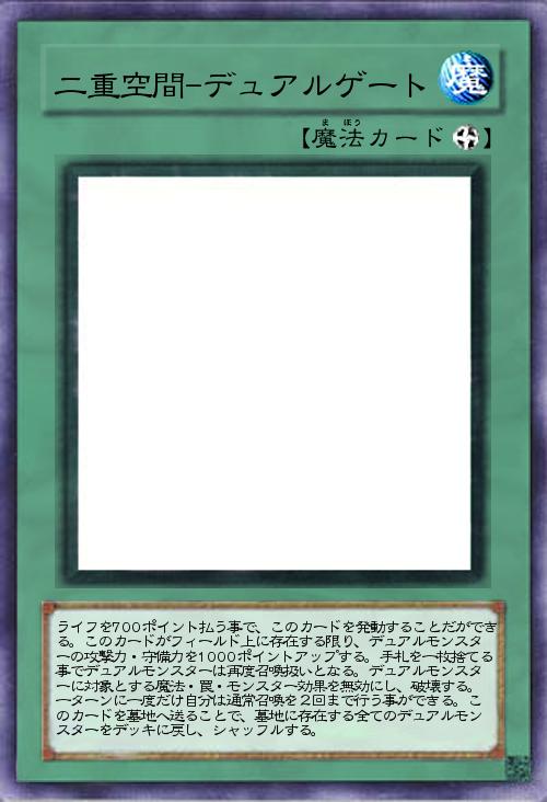 ライフを700ポイント払う事で、このカードを発動することだができる。このカードがフィールド上に存在する限り、デュアルモンスターの攻撃力・守備力を1000ポイントアップする。手札を一枚捨てる事でデュアルモンスターは再度召喚扱いとなる。デュアルモンスターに対象とする魔法・罠・モンスター効果を無効にし、破壊する。一ターンに一度だけ自分は通常召喚を2回まで行う事ができる。このカードを墓地へ送ることで、墓地に存在する全てのデュアルモンスターをデッキに戻し、シャッフルする。 |