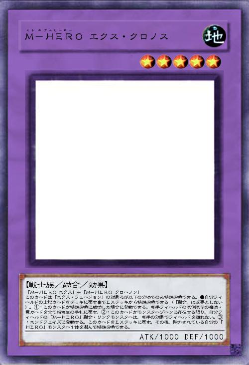 | 「M-HERO エクス」+「M-HERO クローノン」 このカードは「エクス・フュージョン」の効果及び以下の方法でのみ特殊召喚できる。●自分フィールドの上記カードをデッキに戻す事でEXデッキから特殊召喚できる(「融合」は必要としない)。①:このカードが特殊召喚に成功した場合に発動できる。相手フィールドの表側表示の魔法・罠カードを全て持ち主の手札に戻す。②:このカードがモンスターゾーンに存在する限り、自分フィールドの「M-HERO」融合・リンクモンスターは、相手の効果でフィールドを離れない。③:エンドフェイズに発動する。このカードをEXデッキに戻す。その後、除外されている自分の「HERO」モンスター1体を選んで特殊召喚できる。 | |||