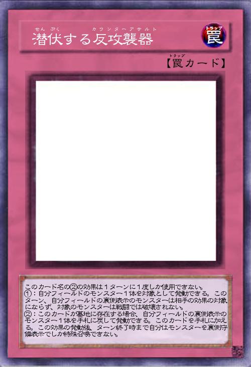 | このカード名の②の効果は1ターンに1度しか使用できない。 ①:自分フィールドのモンスター1体を対象として発動できる。このターン、自分フィールドの裏側表示のモンスターは相手の効果の対象にならず、対象のモンスターは戦闘では破壊されない。 ②:このカードが墓地に存在する場合、自分フィールドの裏側表示のモンスター1体を手札に戻して発動できる。このカードを手札に加える。この効果の発動後、ターン終了時まで自分はモンスターを裏側守備表示でしか特殊召喚できない。 | |||