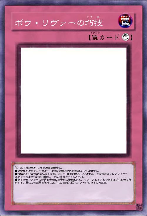 | ①:以下の効果から1つを選び発動する。 ●通常罠かカウンター罠カード1枚の発動と効果を無効にして破壊する。 ●攻撃力か守備力が1500以下のモンスター1体を対象とし破壊する。その後お互いのプレイヤーはデッキの上から3枚を確認し、その内1枚を手札に加える。 ●相手がモンスターの効果を発動した場合に発動出来る。エンドフェイズまで相手は手札を全て除外する。更にこの効果で除外した手札の枚数×200のダメージを相手に与える。 | |||