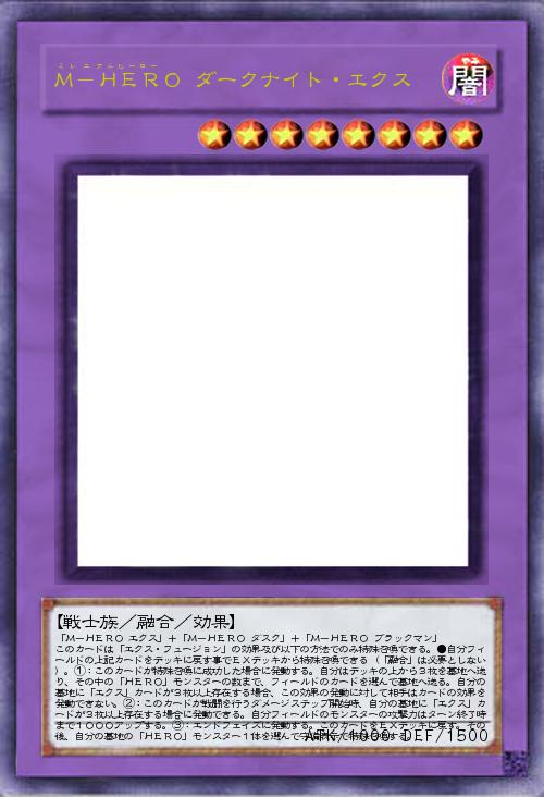 | 「M-HERO エクス」+「M-HERO ダスク」+「M-HERO ブラックマン」 このカードは「エクス・フュージョン」の効果及び以下の方法でのみ特殊召喚できる。●自分フィールドの上記カードをデッキに戻す事でEXデッキから特殊召喚できる(「融合」は必要としない)。①:このカードが特殊召喚に成功した場合に発動する。自分はデッキの上から3枚を墓地へ送り、その中の「HERO」モンスターの数まで、フィールドのカードを選んで墓地へ送る。自分の墓地に「エクス」カードが3枚以上存在する場合、この効果の発動に対して相手はカードの効果を発動できない。②:このカードが戦闘を行うダメージステップ開始時、自分の墓地に「エクス」カードが3枚以上存在する場合に発動できる。自分フィールドのモンスターの攻撃力はターン終了時まで1000アップする。③:エンドフェイズに発動する。このカードをEXデッキに戻す。その後、自分の墓 | |||