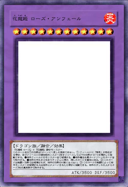 | 「花龍姫 ローズ」+「花龍姫」融合モンスター このカード名の①の効果は1ターンに1度しか使用できない。①:フィールドに「草原」が存在する場合、自分フィールドの植物族モンスター2体をリリースして以下の効果から1つを選択して発動できる。●相手フィールドのモンスター全て破壊する。●相手魔法&罠カードゾーンのカード全て除外する。●相手の手札を2枚までランダムに選び、選んだカードを墓地に送る。②:このカードは戦闘・効果では破壊されず、相手の効果の対象にならない。③:このカードの戦闘によって相手モンスターを破壊する又は相手にダメージを与えた場合に発動できる。相手のデッキの上からカード3枚を裏側表示で除外する。 | |||