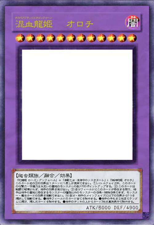 | 「花龍姫 ローズ・アンフェール」+「海歌乙女 深海守のソステヌート」+「偽神蛇姫 オロチ」 このカード名の③の効果は1ターンに1度しか使用できない。①:バトルフェイズ中、このカードの攻撃力・守備力はお互いの墓地のモンスターの数×100ポイントアップする。②:このカードは戦闘で破壊されず、相手の効果を受けない。③:自分フィールドにこのカードが存在する限り、相手は相手の墓地に存在するモンスターの種族以外のモンスターの召喚・特殊召喚できず、モンスター・魔法カードの効果を発動できない。④:自分・相手のメインフェイズに以下の効果から1つを選択して発動できる。●相手フィールドのカード全てを除外する。●相手の手札を2枚までランダムに選び、選んだカードを除外する。●相手のデッキの上からカード3枚を裏側表示で除外する。 | |||