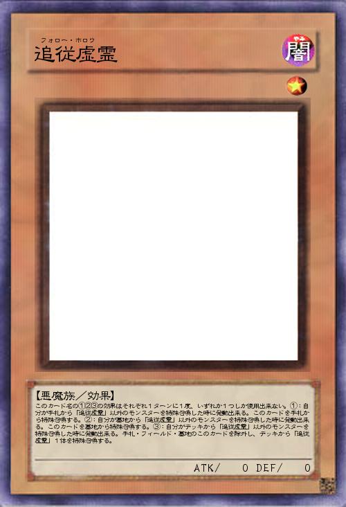 | このカード名の①②③の効果はそれぞれ1ターンに1度、いずれか1つしか使用出来ない。①:自分が手札から「追従虚霊」以外のモンスターを特殊召喚した時に発動出来る。このカードを手札から特殊召喚する。②:自分が墓地から「追従虚霊」以外のモンスターを特殊召喚した時に発動出来る。このカードを墓地から特殊召喚する。③:自分がデッキから「追従虚霊」以外のモンスターを特殊召喚した時に発動出来る。手札・フィールド・墓地のこのカードを除外し、デッキから「追従虚霊」1体を特殊召喚する。 | |||