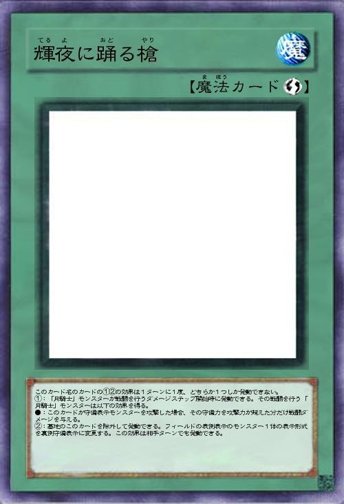 | このカード名のカードの①②の効果は1ターンに1度、どちらか1つしか発動できない。 ①:「月騎士」モンスターが戦闘を行うダメージステップ開始時に発動できる。その戦闘を行う「月騎士」モンスターは以下の効果を得る。 ●:このカードが守備表示モンスターを攻撃した場合、その守備力を攻撃力が超えた分だけ戦闘ダメージを与える。 ②:墓地のこのカードを除外して発動できる。フィールドの表側表示のモンスター1体の表示形式を裏側守備表示に変更する。この効果は相手ターンでも発動できる。 | |||