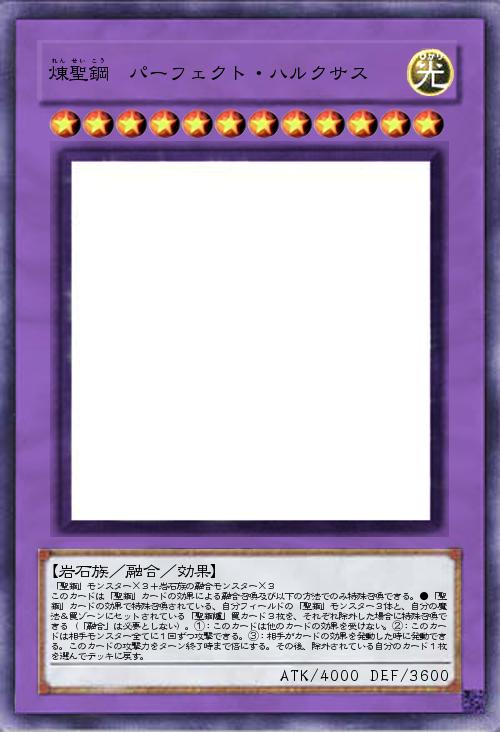 | 「聖鋼」モンスター×3+岩石族の融合モンスター×3 このカードは「聖鋼」カードの効果による融合召喚及び以下の方法でのみ特殊召喚できる。●「聖鋼」カードの効果で特殊召喚されている、自分フィールドの「聖鋼」モンスター3体と、自分の魔法&罠ゾーンにセットされている「聖鋼爐」罠カード3枚を、それぞれ除外した場合に特殊召喚できる(「融合」は必要としない)。①:このカードは他のカードの効果を受けない。②:このカードは相手モンスター全てに1回ずつ攻撃できる。③:相手がカードの効果を発動した時に発動できる。このカードの攻撃力をターン終了時まで倍にする。その後、除外されている自分のカード1枚を選んでデッキに戻す。 | |||