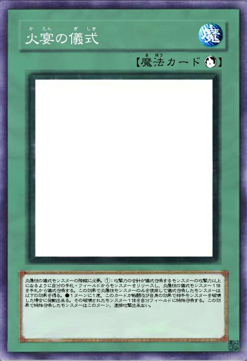 | 炎属性の儀式モンスターの降臨に必要。①:攻撃力の合計が儀式召喚するモンスターの攻撃力以上になるように自分の手札・フィールドからモンスターをリリースし、炎属性の儀式モンスター1体を手札から儀式召喚する。この効果で炎属性モンスターのみを使用して儀式召喚したモンスターは以下の効果を得る。●1ターンに1度、このカードが戦闘及び自身の効果で相手モンスターを破壊した場合に発動出来る。その破壊されたモンスター1体を自分フィールドに特殊召喚する。この効果で特殊召喚したモンスターはこのターン、直接攻撃出来ない。 | |||