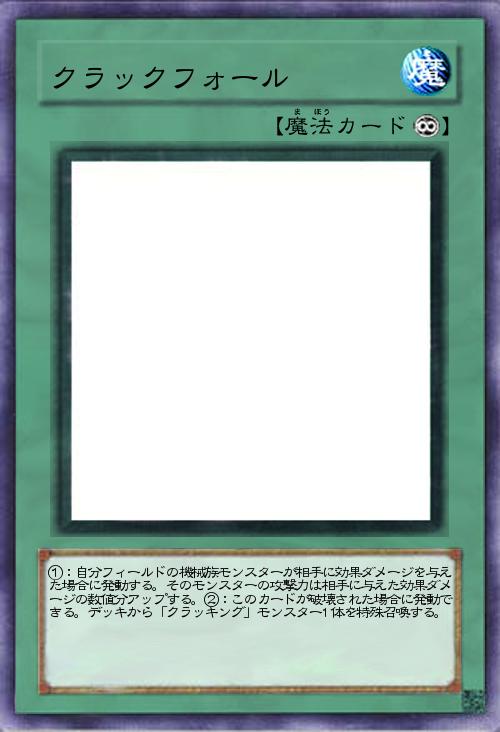 | ①:自分フィールドの機械族モンスターが相手に効果ダメージを与えた場合に発動する。そのモンスターの攻撃力は相手に与えた効果ダメージの数値分アップする。②:このカードが破壊された場合に発動できる。デッキから「クラッキング」モンスター1体を特殊召喚する。 | |||