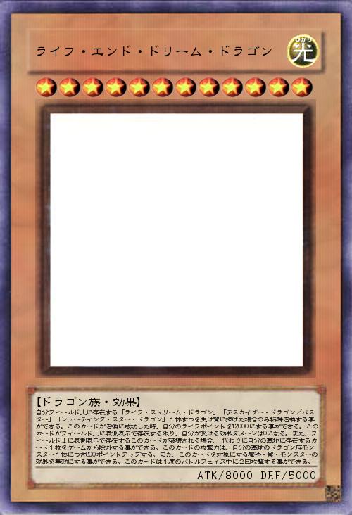 | 自分フィールド上に存在する「ライフ・ストリーム・ドラゴン」「デスカイザー・ドラゴン/バスター」「シューティング・スター・ドラゴン」1体ずつを生け贄に捧げた場合のみ特殊召喚する事ができる。このカードが召喚に成功した時、自分のライフポイントを12000にする事ができる。このカードがフィールド上に表側表示で存在する限り、自分が受ける効果ダメージは0になる。また、フィールド上に表側表示で存在するこのカードが破壊される場合、 代わりに自分の墓地に存在するカード1枚をゲームから除外する事ができる。このカードの攻撃力は、自分の墓地のドラゴン族モンスター1体につき800ポイントアップする。また、このカードを対象にする魔法・罠・モンスターの効果を無効にする事ができる。このカードは1度のバトルフェイズ中に2回攻撃する事ができる。 | |||