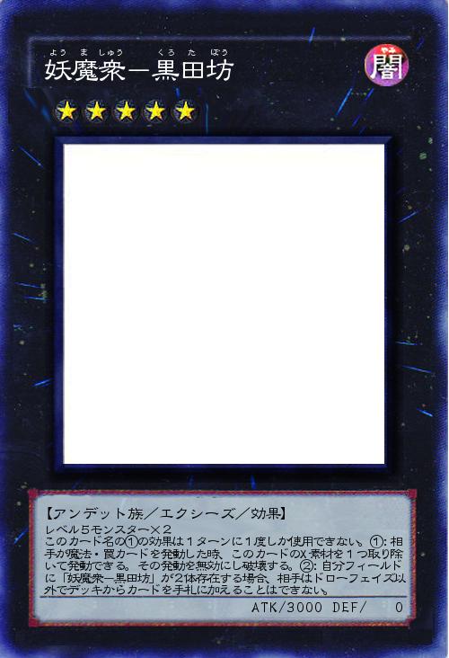 | レベル5モンスター×2 このカード名の①の効果は1ターンに1度しか使用できない。①:相手が魔法・罠カードを発動した時、このカードのX素材を1つ取り除いて発動できる。その発動を無効にし破壊する。②:自分フィールドに「妖魔衆-黒田坊」が2体存在する場合、相手はドローフェイズ以外でデッキからカードを手札に加えることはできない。 | |||