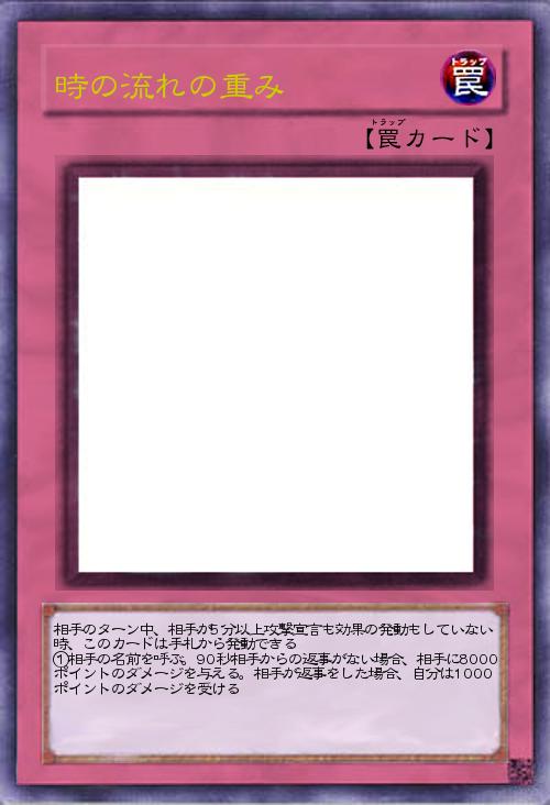| 相手のターン中、相手が5分以上攻撃宣言も効果の発動もしていない時、このカードは手札から発動できる ①相手の名前を呼ぶ。90秒相手からの返事がない場合、相手に8000ポイントのダメージを与える。相手が返事をした場合、自分は1000ポイントのダメージを受ける | |||
