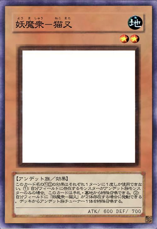 | このカード名の①②の効果はそれぞれ1ターンに1度しか使用できない。①:自分フィールドに存在するモンスターがアンデット族モンスターのみの場合、このカードは手札・墓地から特殊召喚できる。②:自分フィールドに「妖魔衆-猫又」が2体存在する場合に発動できる。デッキからアンデット族チューナー1体を特殊召喚する。 | |||