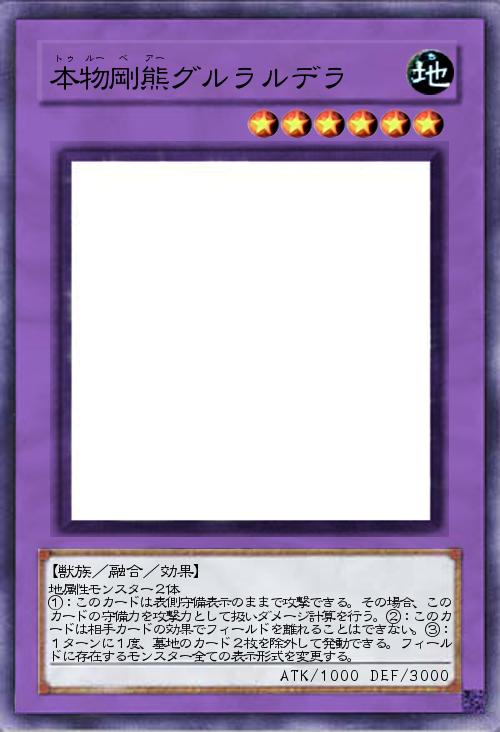 | 地属性モンスター2体 ①:このカードは表側守備表示のままで攻撃できる。その場合、このカードの守備力を攻撃力として扱いダメージ計算を行う。②:このカードは相手カードの効果でフィールドを離れることはできない。③:1ターンに1度、墓地のカード2枚を除外して発動できる。フィールドに存在するモンスター全ての表示形式を変更する。 | |||