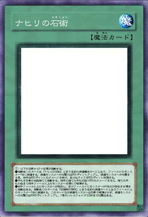 | ①:以下の効果から1つを選び発動する。 ●発動後このカードは「ナヒリの石剣」と言う名前の装備魔法カードとなり、フィールドのモンスター1体に装備する。装備モンスターの攻撃力は600ポイントアップし、装備モンスターが攻撃する度、相手は600ポイントのダメージを受け、自分はライフを600ポイント回復する。 ●手札を任意の枚数捨てて発動する。相手に捨てた手札の数×600のダメージを与え、捨てた手札の数まで相手フィールド上のモンスターを選んで破壊する。 ●相手フィールド上にモンスターが存在し、自分フィールドにモンスターが1体だけ存在する場合に発動出来る。発動後このカードは「石術師の傑作」と言う名前の装備カードとなりフィールド上のモンスター1体に装備する。このカード及び装備モンスターは効果で破壊されず、装備モンスターの攻撃力は1000ポイントアップし、1度のバトルフェイズで2回まで攻撃出来る。 | |||