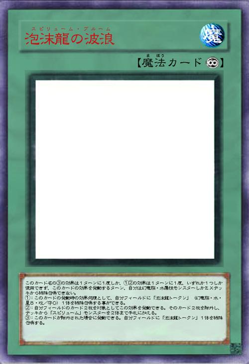 | このカード名の③の効果は1ターンに1度しか、①②の効果は1ターンに1度、いずれか1つしか使用できず、このカードの効果を発動するターン、自分は幻竜族・水属性モンスターしかEXデッキから特殊召喚できない。 ①:このカードの発動時の効果処理として、自分フィールドに「泡沫龍トークン」(幻竜族・水・星8・攻/守0)1体を特殊召喚する事ができる。 ②:自分フィールドのカード2枚を対象としてこの効果を発動できる。そのカード2枚を除外し、デッキから「スピリューム」モンスターを2体まで手札に加える。 ③:このカードが除外された場合に発動できる。自分フィールドに「泡沫龍トークン」1体を特殊召喚する。 | |||