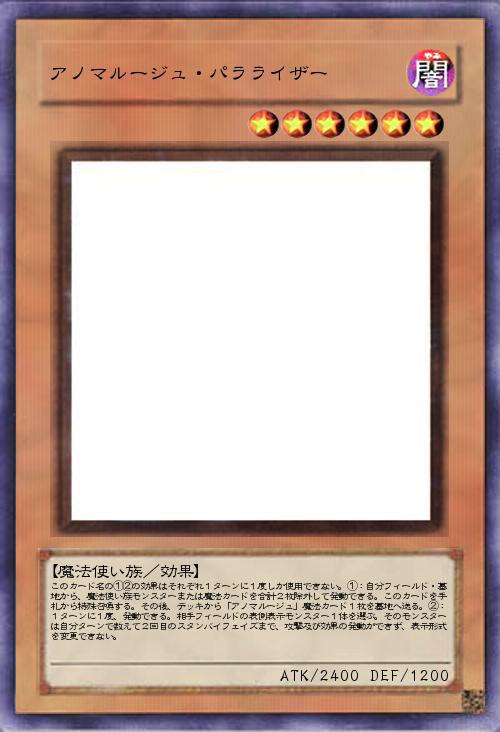 | このカード名の①②の効果はそれぞれ1ターンに1度しか使用できない。①:自分フィールド・墓地から、魔法使い族モンスターまたは魔法カードを合計2枚除外して発動できる。このカードを手札から特殊召喚する。その後、デッキから「アノマルージュ」魔法カード1枚を墓地へ送る。②:1ターンに1度、発動できる。相手フィールドの表側表示モンスター1体を選ぶ。そのモンスターは自分ターンで数えて2回目のスタンバイフェイズまで、攻撃及び効果の発動ができず、表示形式を変更できない。 | |||