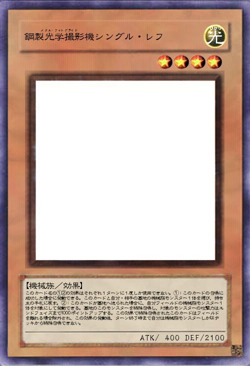 | このカード名の①②の効果はそれぞれ1ターンに1度しか使用できない。①:このカードの召喚に成功した場合に発動できる。このカードと自分・相手の墓地の機械族モンスター1体を選び、持ち主の手札に戻す。②:このカードが墓地へ送られた場合に、自分フィールドの機械族モンスター1体を対象にして発動できる。墓地のこのモンスターを特殊召喚し、対象のモンスターの攻撃力はエンドフェイズまで1000ポイントアップする。この効果で特殊召喚されたこのカードはフィールドを離れる場合除外され、この効果の発動後、ターン終了時まで自分は機械族モンスターしかEXデッキから特殊召喚できない。 | |||