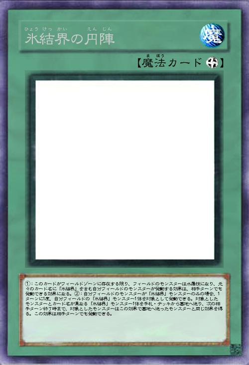 | ①:このカードがフィールドゾーンに存在する限り、フィールドのモンスターは水属性になり、元々のカード名に「氷結界」を含む自分フィールドのモンスターが発動する効果は、相手ターンでも発動できる効果になる。②:自分フィールドのモンスターが「氷結界」モンスターのみの場合、1ターンに1度、自分フィールドの「氷結界」モンスター1体を対象として発動できる。対象としたモンスターとカード名が異なる「氷結界」モンスター1体を手札・デッキから墓地へ送り、次の相手ターン終了時まで、対象としたモンスターはこの効果で墓地へ送ったモンスターと同じ効果を得る。この効果は相手ターンでも発動できる。 | |||