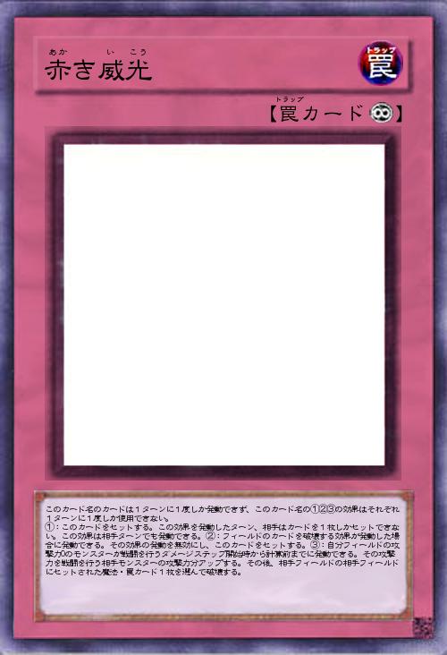 | このカード名のカードは1ターンに1度しか発動できず、このカード名の①②③の効果はそれぞれ1ターンに1度しか使用できない。 ①:このカードをセットする。この効果を発動したターン、相手はカードを1枚しかセットできない。この効果は相手ターンでも発動できる。②:フィールドのカードを破壊する効果が発動した場合に発動できる。その効果の発動を無効にし、このカードをセットする。③:自分フィールドの攻撃力0のモンスターが戦闘を行うダメージステップ開始時から計算前までに発動できる。その攻撃力を戦闘を行う相手モンスターの攻撃力分アップする。その後、相手フィールドの相手フィールドにセットされた魔法・罠カード1枚を選んで破壊する。 | |||