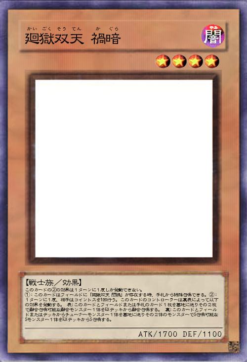 | このカードの②の効果は1ターンに1度しか発動できない。 ①:このカードはフィールドに「廻獄双天 閃禍」が存在する時、手札から特殊召喚できる。②:1ターンに1度、相手はコイントスを1回行う。このカードのコントローラーは裏表によって以下の効果を発動する。 表:このカードとフィールドまたは手札のカード1枚を墓地に送りその2枚で融合召喚可能な融合モンスター1体をEXデッキから融合召喚する。 裏:このカードとフィールドまたはデッキからチューナーモンスター1体を墓地に送りその2体のモンスターでS召喚可能なSモンスター1体をEXデッキからS召喚する。 | |||