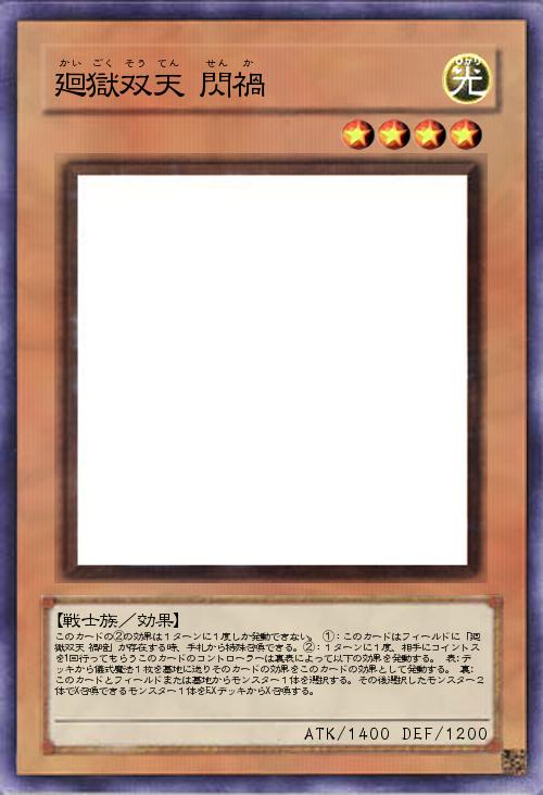| このカードの②の効果は1ターンに1度しか発動できない。 ①:このカードはフィールドに「廻獄双天 禍暗」が存在する時、手札から特殊召喚できる。②:1ターンに1度、相手にコイントスを1回行ってもらうこのカードのコントローラーは裏表によって以下の効果を発動する。 表:デッキから儀式魔法1枚を墓地に送りそのカードの効果をこのカードの効果として発動する。 裏:このカードとフィールドまたは墓地からモンスター1体を選択する。その後選択したモンスター2体でX召喚できるモンスター1体をEXデッキからX召喚する。 | |||