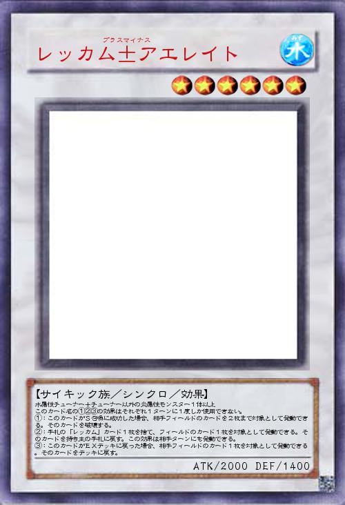 | 水属性チューナー+チューナー以外の炎属性モンスター1体以上 このカード名の①②③の効果はそれぞれ1ターンに1度しか使用できない。 ①:このカードがS召喚に成功した場合、相手フィールドのカードを2枚まで対象として発動できる。そのカードを破壊する。 ②:手札の「レッカム」カード1枚を捨て、フィールドのカード1枚を対象として発動できる。そのカードを持ち主の手札に戻す。この効果は相手ターンにも発動できる。 ③:このカードがEXデッキに戻った場合、相手フィールドのカード1枚を対象として発動できる。そのカードをデッキに戻す。 | |||