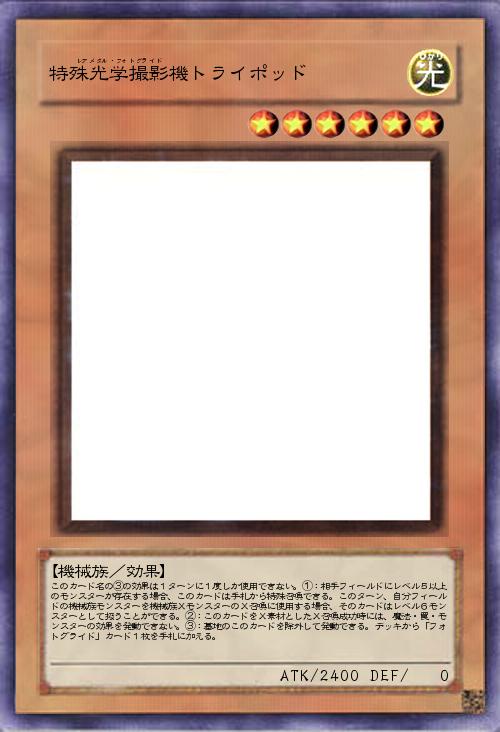 | このカード名の③の効果は1ターンに1度しか使用できない。①:相手フィールドにレベル5以上のモンスターが存在する場合、このカードは手札から特殊召喚できる。このターン、自分フィールドの機械族モンスターを機械族XモンスターのX召喚に使用する場合、そのカードはレベル6モンスターとして扱うことができる。②:このカードをX素材としたX召喚成功時には、魔法・罠・モンスターの効果を発動できない。③:墓地のこのカードを除外して発動できる。デッキから「フォトグライド」カード1枚を手札に加える。 | |||