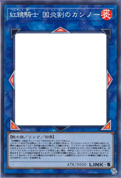 | 「紅鏡騎士 炎剣のカンノーネ」1体を含むモンスター2体以上 このカード名の①の効果は1ターンに1度しか使用できない。①:このカードのリンク召喚に成功した場合に墓地のモンスターを任意の数だけ除外して発動できる。リンクマーカーの合計が除外した数以下になるようにリンク2以下の「紅鏡騎士」リンクモンスターを4体までEXデッキから特殊召喚する。②:フィールドにセットされているカードが存在しない場合、相手は1ターンにこのカードのリンク先に存在するカードの枚数の回数までしかカードの効果を発動できない。③:このカードまたはこのカードのリンク先のモンスターが炎属性以外の相手モンスターと戦闘を行ったダメージ計算後に発動できる。その相手モンスターを破壊する。 | |||